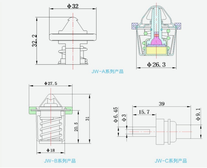 運動中的發動機在負荷增大的情況下,發動機水套中的水溫會急劇上升,若不及時調節溫度,會增加發動機燃料消 耗和機件的暦損。節溫器安裝于發動機冷卻水回路中,當發動機水套內的水溫上升到不利溫度時,節溫器感應到溫 度后,其內部元件開始動作,克服彈簧彈力,頂開閥門,此時高溫度的水經節溫器流入散熱器進行冷卻,回流入水 套,冷卻發動機,當水套內水溫正常時,節溫器在彈簧彈力的作用下,關閉閥門,從而保護發動機正常工作。